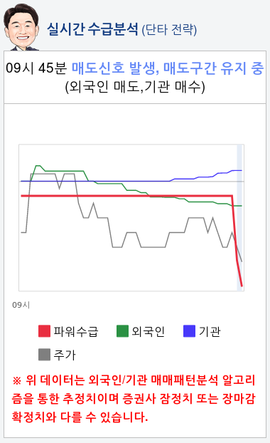 알파고가 분석한 덕산네오룩스 종목의 외국인·기관 당일 실시간 수급은 현재 외국인은 매도하고 있고 기관은 매수하고 있으며, 종합 수급분석 평가지표인 파워수급은 09시 45분 부터 현재까지 매도 에너지가 더 높은 것으로 분석하고 있다.