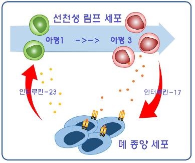 관찰 결과를 보면 폐암세포가 분비한 `인터류킨-23`에 의해 종양 안에 있는 `선천성 림프구 세포`의 아형1이 아형3으로 변했고, 이때 증가한 아형3이 단백질 `인터류킨-17`을 분비해 다시 폐암세포 성장을 촉진하는 것으로 나타났다.