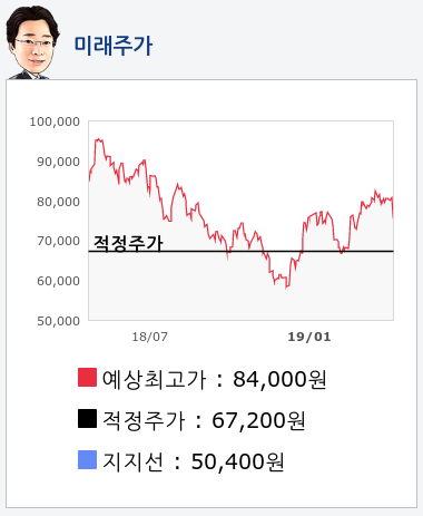 알파고의 재무데이터 분석 결과에 따르면 적정주가는 67,200원을 예상하고 있으며, 목표주가는 84,000원, 지지선은 50,400원 으로 예상하고 있다.