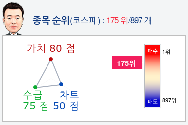 알파고가 가치, 수급, 차트로 평가한 SK하이닉스종목의 현재 종합순위는 코스피 897개 종목 중 175위로, 알파고는 SK하이닉스기업의 가치와 수급을 높게 평가 분석하고 있다.