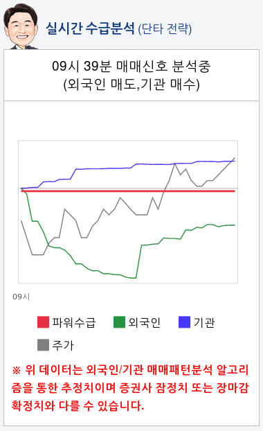 알파고가 분석한 SK하이닉스 종목의 외국인·기관 당일 실시간 수급은 현재 외국인은 매도하고 있고 기관은 매수하고 있으며, 종합 수급분석 평가지표인 파워수급은 09시 00분 부터 현재까지 추정이 불가한 것으로 분석하고 있다.