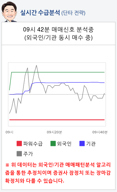 외국인, 기관 수급을 보면 외국인은 4일 연속매수하고 있고, 기관은 3일 연속 매수하였다. 알파고는 외국인, 기관의 추가 매수 가능성을 80%로 예상하고 있다.