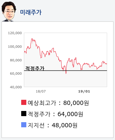 알파고의 재무데이터 분석 결과에 따르면 적정주가는 64,000원을 예상하고 있으며, 목표주가는 80,000원, 지지선은 48,000원 으로 예상하고 있다.