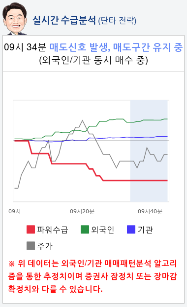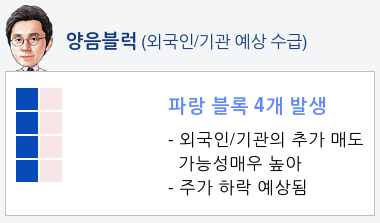 외국인, 기관 수급을 보면 외국인은 3일 연속 매도하고 있고, 기관은 매도전환하였다. 알파고는 외국인, 기관의 추가 매도 가능성을 80%로 예상하고 있다.