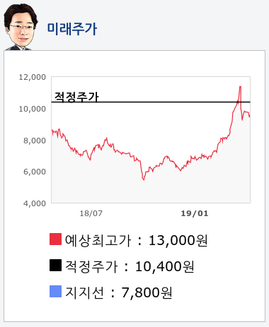알파고의 재무데이터 분석 결과에 따르면 적정주가는 10,400원을 예상하고 있으며, 목표주가는 13,000원, 지지선은 7,800원 으로 예상하고 있다.