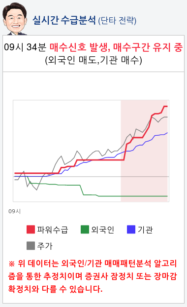 외국인, 기관 수급을 보면 외국인은 매도전환하고 있고, 기관은 9일 연속 매수하였다. 알파고는 외국인, 기관의 추가 매수 가능성을 18%로 예상하고 있다.