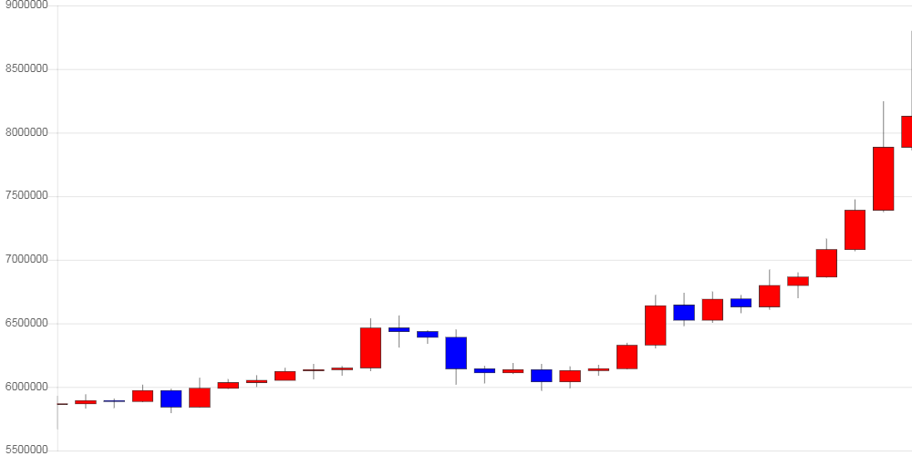 전일 대비 최저가는 7,960,000원, 최고가는 8,800,000원이었다. 1일 거래량은 2,632 BTC이며, 거래대금은 약 22,359,489,596원이었다.