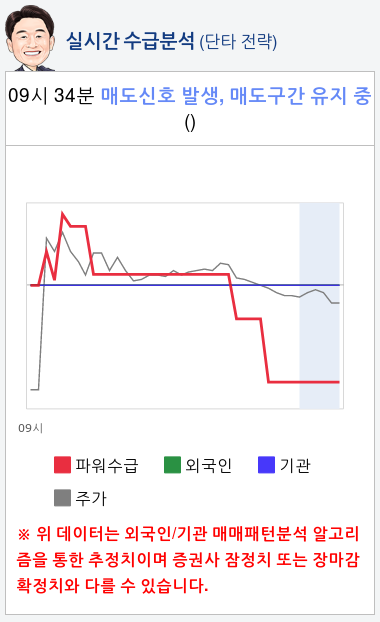 외국인, 기관 수급을 보면 외국인은 3일 연속 매도하고 있고, 기관은 수급이 없다. 알파고는 외국인, 기관의 추가 매도 가능성을 16%로 예상하고 있다.