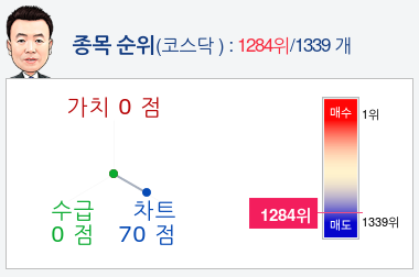 (위의 종목알파고 분석은 기업의 가치, 차트, 재무, 외인/기관 수급 등 과거 데이터를 분석하여 향후 주가의 방향을 예상 하였으며, 높은 수익률을 보장하지는 않습니다. 위의 자료는 투자 참고용으로 제시해 드리는 것이며, `종목알파고 유망종목 Top5`는 주식창앱에서 확인하실 수 있습니다.)
