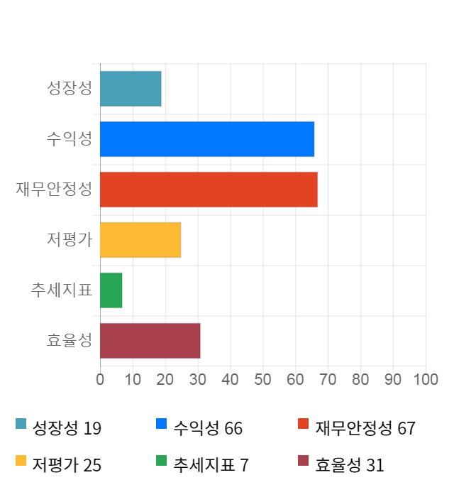 AI 인공지능 종목 분석 시스템을 이용해 성장성, 수익성, 효율성, 안전성, 저평가성, 추세 등 주가 수익률에 영향을 줄 수 있는 6가지 핵심 투자 지표를 점수화하여 종목의 투자 매력도를 계산해보았다.