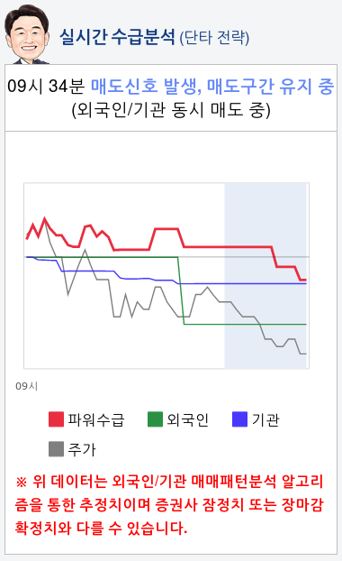외국인, 기관 수급을 보면 외국인은 4일 연속매수하고 있고, 기관은 3일 연속 매도하였다. 알파고는 외국인, 기관의 추가 매수 가능성을 28%로 예상하고 있다.
