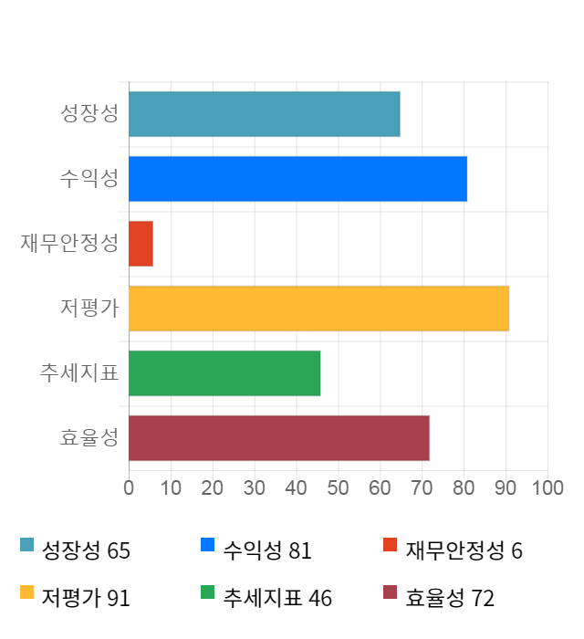 AI 인공지능 종목 분석 시스템을 이용해 성장성, 수익성, 효율성, 안전성, 저평가성, 추세 등 주가 수익률에 영향을 줄 수 있는 6가지 핵심 투자 지표를 점수화하여 종목의 투자 매력도를 계산해보았다.