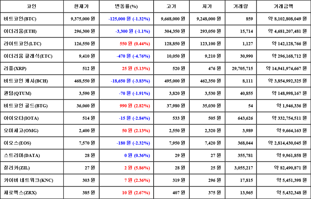 현재 암호화폐 거래소 "코인원"에 따르면 가상화폐 대장 격인 비트코인의 시세는 24시간 전 대비 125,000원(-1.32%) 하락한 9,375,000원에 거래되고 있다.