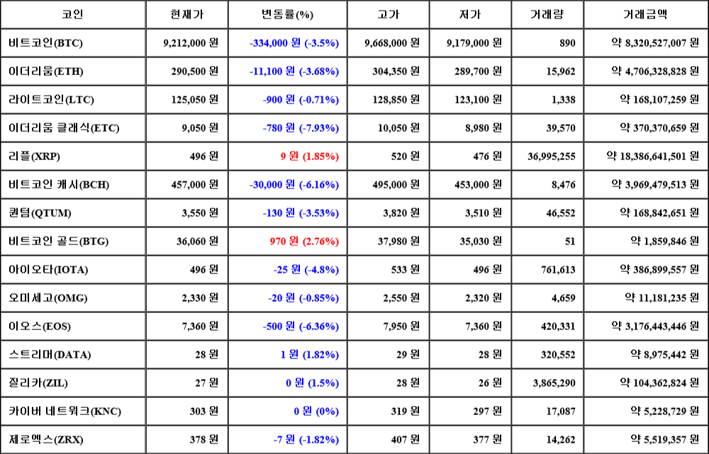 또한, 이오스(-6.36%, 7,360원), 비트코인 캐시(-6.16%, 457,000원), 아이오타(-4.8%, 496원), 이더리움(-3.68%, 290,500원), 퀀텀(-3.53%, 3,550원), 제로엑스(-1.82%, 378원), 오미세고(-0.85%, 2,330원), 라이트코인(-0.71%, 125,050원)은 하락세를 나타냈다.