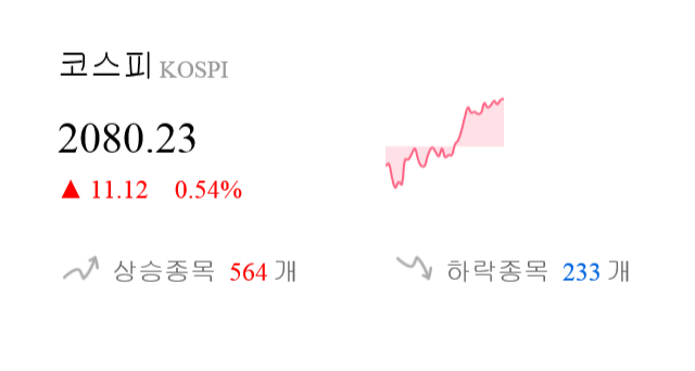 6월 7일 12시 0분 코스피는 전일 대비 11.12p(0.54%) 상승한 2080.23p를 기록하고 있다.