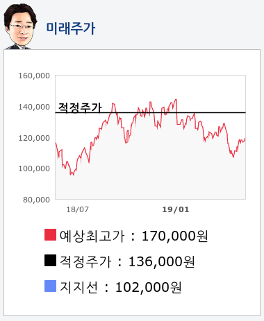알파고의 재무데이터 분석 결과에 따르면 적정주가는 136,000원을 예상하고 있으며, 목표주가는 170,000원, 지지선은 102,000원 으로 예상하고 있다.
