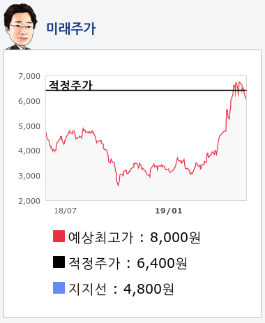 알파고의 재무데이터 분석 결과에 따르면 적정주가는 6,400원을 예상하고 있으며, 목표주가는 8,000원, 지지선은 4,800원 으로 예상하고 있다.