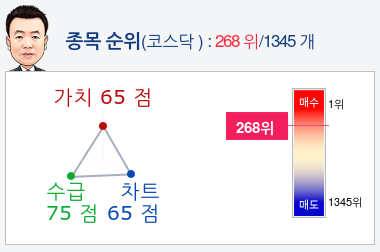 알파고가 가치, 수급, 차트로 평가한 쏠리드종목의 현재 종합순위는 코스닥 1345개 종목 중 268위로, 알파고는 쏠리드기업의 수급을 높게 평가 분석하고 있다.