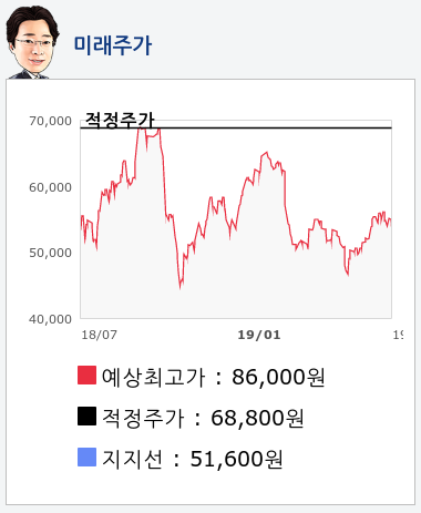 알파고의 재무데이터 분석 결과에 따르면 적정주가는 68,800원을 예상하고 있으며, 목표주가는 86,000원, 지지선은 51,600원 으로 예상하고 있다.