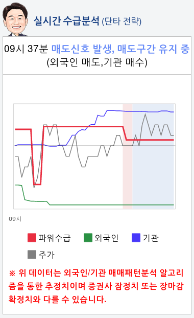 알파고가 분석한 현대건설 종목의 외국인·기관 당일 실시간 수급은 현재 외국인은 매도하고 있고 기관은 매수하고 있으며, 종합 수급분석 평가지표인 파워수급은 09시 37분 부터 현재까지 매도 에너지가 더 높은 것으로 분석하고 있다.