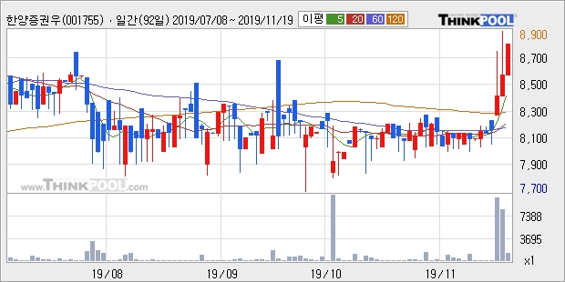 개장 초반부터 한양증권우(001755)가 급등세를 나타내고 있다.