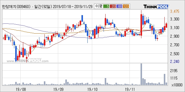 코스피시장에서 백판지 제조업체인 한창제지(009460)가 큰 폭으로 상승하며 장을 마감했다.