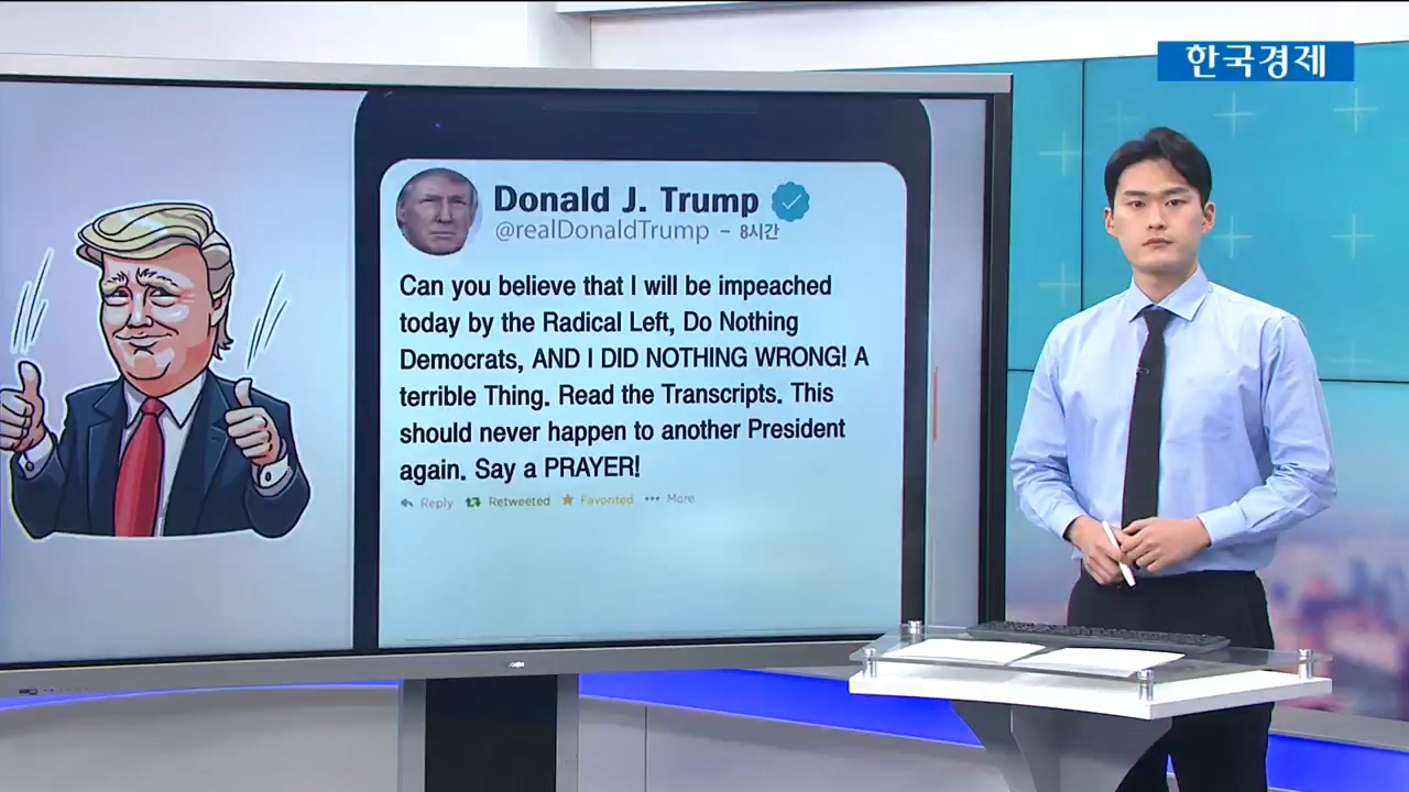 8시간 전 트윗을 살펴보면, 그는 “오늘 내가 급진좌파 ‘아무 일도 하지 않는 민주당’에 의해 탄핵될 거라는 게 믿어지는가, 나는 아무 잘못도 안했다! 끔찍한 일이다. 통화기록을 읽으라. 이런 일이 또 다른 대통령에게 일어나서는 안 된다. 기도하라!"라고 말했습니다.