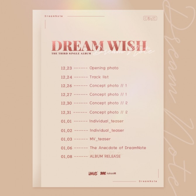 23일 소속사 iMe KOREA(아이엠이 코리아)는 “드림노트(유아이, 보니, 라라, 미소, 수민, 은조)가 내년 1월 8일 오후 6시 세 번째 싱글 앨범 ‘드림 위시(Dream Wish)’를 발매할 예정”이라고 밝혔다.
