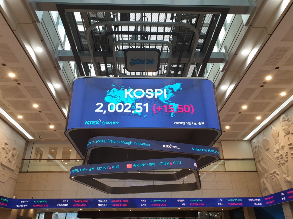 2일 코스피는 전 거래일 대비 15.50pt(0.78%) 오른 2,002.51에 거래를 마쳤다.