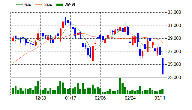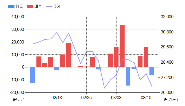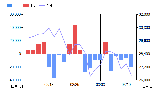 최근 한달 간 외국인은 8만주를 순매도해 외국인 보유비율은 7.08%로 감소했으며, 기관은 10만주를 순매수했다.