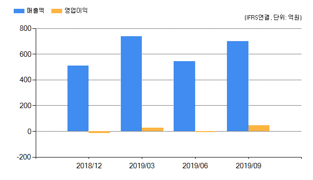 2019년 3사분기 매출액은 701억원으로 전년 동기 대비 24.29% 상승 하였고 지난 3년 평균 매출액 증가율은 4.50% 이다. 영업이익은 46억으로 이전 분기 보다 상승 하였으며, 당기 순이익은 27억원이다.