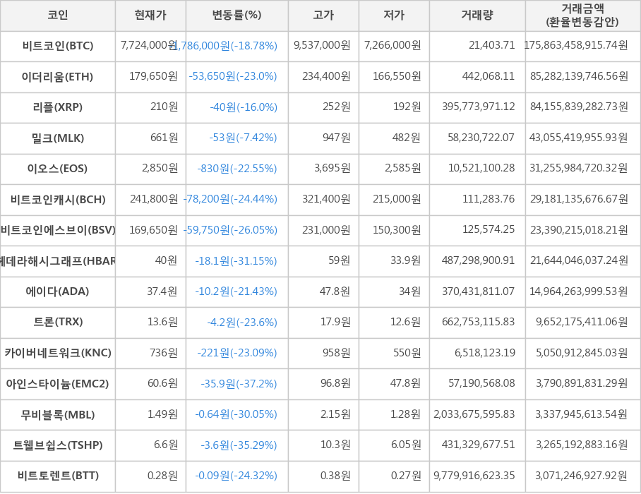 또한, 트웰브쉽스(-35.29%, 6.6원), 헤데라해시그래프(-31.15%, 40원), 무비블록(-30.05%, 1.49원), 비트코인에스브이(-26.05%, 169,650원), 비트코인캐시(-24.44%, 241,800원), 비트토렌트(-24.32%, 0.28원), 트론(-23.6%, 13.6원), 카이버네트워크(-23.09%, 736원), 이더리움(-23.0%, 179,650원), 이오스(-22.55%, 2,850원), 에이다(-21.43%, 37.4원), 리플(-16.0%, 210원), 밀크(-7.42%, 661원)가 하락세를 나타냈다.