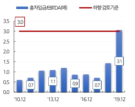 일반적으로 [총차입금/EBITDA]가 3배 수준일 때 신용등급 하향 검토 지표로 읽힌다.
