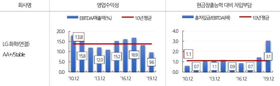 NICE신용평가는 LG화학의 연결기준 CAPEX(미래이윤 창출위한 지출비용) 규모는 2015년 1.5조원에서 2019년 6.4조원으로 크게 증가했으며, 동 투자 관련 자금소요로 총차입금 규모는 2015년 말 2.6조 원에서 2019년 말 8.4조 원으로 확대됐다고 밝혔다. 그러면서 석유화학 호황기였던 2016년부터 2018년 상반기에는 매우 우수한 수익성 및 현금창출 능력을 바탕으로 차입 부담이 일정 수준 이내로 관리됐지만, 최근 불리한 산업환경에 따른 석유화학 사업 부문의 실적 저하 및 배터리 부문의 수익창출 지연 등으로 LG화학의 신용등급 하향 검토 지표인 [총차입금 / EBITDA(법인세·이자·감가상각비 차감 전 영업이익)]는 2019년 말 현재 3.1배로 하향검토 조건을 충족하고 있다고 지적했다.