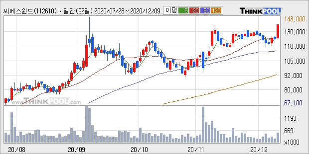 이 시각 거래소에서 씨에스윈드 이외에도 바이오리더스(11.17%), 위지윅스튜디오(11.48%), 베스파(29.77%), CMG제약(13.97%), 포인트모바일(12.78%) 등이 상승세를 보이고 있다.