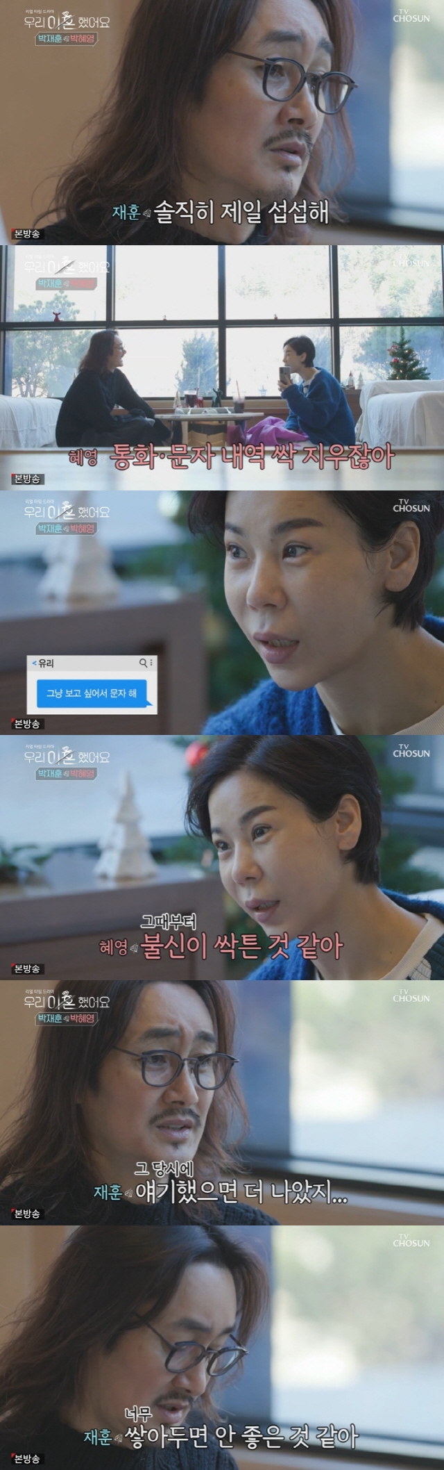 박혜영은 이를 계기로 불신이 싹텄다고 고백했다. 13년 만에 처음으로 밝힌 속내에 박재훈은 어쩔 줄 몰라했다. 그는 "명쾌하게 말할 수 있다"라며 "주변 형들이 나한테 얘기를 많이 했었다. 아내한테 꼬투리 잡히면 안되니까 집에 가면 다 지워야 된다고. 그래서 그렇게 했던 것뿐이다"라고 해명했다.