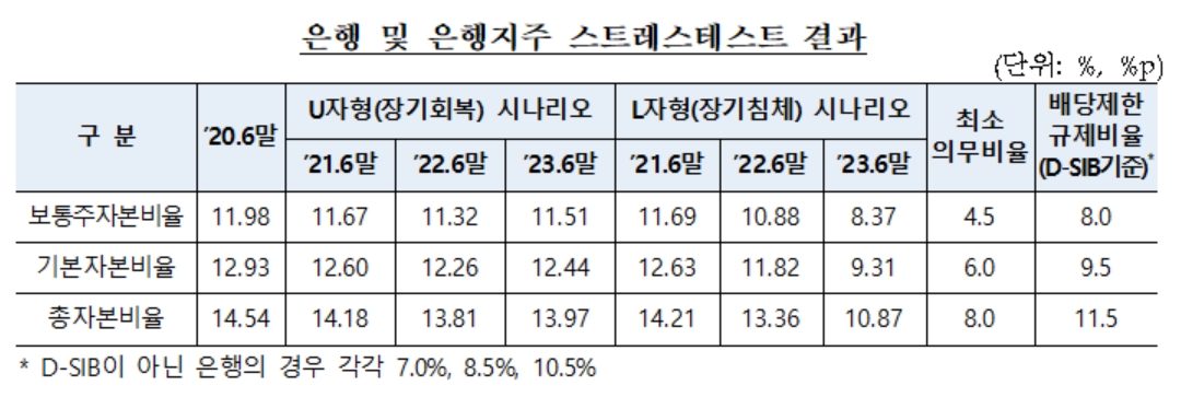 그러나 경기 침체가 길어지는 `L자형` 시나리오에서 은행 상당수가 보통주자본비율 7%, 기본자본비율 8.5%, 총자본비율 10.5% 등 `배당제한 규제 비율`을 충족하지 못할 것으로 드러났다.