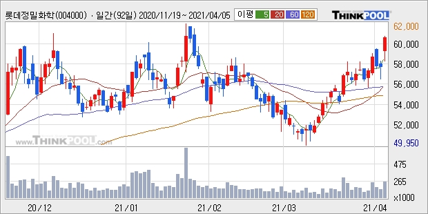 5일 오전 일반화학 및 정밀화학 제품 전문기업로 알려진 롯데정밀화학(004000)이 큰 폭으로 상승했다.