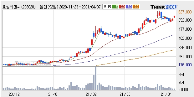 7일 오전 효성티앤씨(298020)가 급등세를 보이고 있다. 효성티앤씨는 화학섬유 제조 및 무역업체로 알려져 있다.