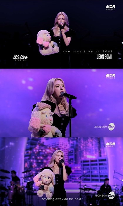 이날 귀여운 인형을 안고 등장한 전소미는 블랙 원피스를 입고 화려한 비주얼을 자랑해 단숨에 시선을 사로잡았다. 라이브에 앞서 전소미는 "연말이라 인형을 들고나왔는데 귀엽게 봐주셨으면 좋겠다. 모두 행복하고 따뜻한 연말 보내시길 바란다"며 따뜻한 인사를 전했다.