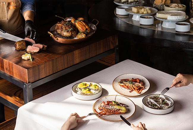 그 뒤로 식욕을 돋워줄 애피타이저, 에그 베네딕트 등의 브런치 메뉴들, 프렌치 어니언 스프와 각종 파스타, 도미 구이, 비프 부르기뇽 등 뷔페 음식들에 대한 웨이터의 친절한 설명이 이어진다. 고객은 자리에 편희 앉아 웨이터에게 원하는 음식들을 주문하면, 오픈 키친에서 셰프들이 능숙한 손놀림으로 음식을 요리하는 것을 볼 수 있다. 여기에 스테이크 하우스답게 먹음직스럽게 익혀진 시트러스 로스트 치킨, 슬로우 쿡 램 숄더, 크러스트 페퍼 로스트 비프는 카빙 트롤리로 준비되어 셰프가 직접 각 테이블을 돌아다니며 고객의 취향에 맞는 고기를 즉석에서 썰어 서빙한다.