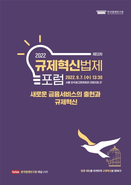 한국법제연구원(원장 김계홍)이 9월 7일 수요일 1시 30분 한국광고문화회관 대회의장에서 `새로운 금융서비스의 출현과 규제혁신`을 주제로 제 13차 규제혁신법제포럼을 개최한다.