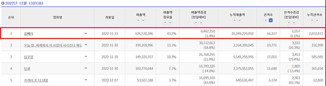 영화관 입장권 통합전산망(12월 14일 오전 7시 기준)에 따르면 ‘올빼미’는 누적 265만 2071명의 관객을 끌어모으며 박스오피스 1위 자리를 지켜냈다. 이는 개봉 이후 21일 동안 연속으로 박스오피스 1위를 차지한 것으로, 특히 2022년 개봉한 영화 중 최장 기록이라는 점에서 이목을 집중시킨다.