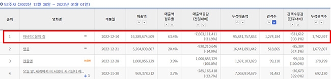 영화관입장권 통합전산망에 따르면 ‘아바타: 물의 길’이 1월 2일 오전 7시 기준, 12월 30일~1월 1일 3일간 127만 4184명, 누적 774만 2597명의 관객 수를 기록하며 개봉 3주 차에도 박스오피스 1위 자리를 굳건히 했다.