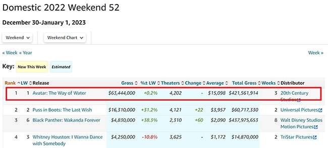 또한 박스오피스 모조에 따르면 ‘아바타: 물의 길’이 개봉 3주 차 주말에 흥행 수익 6344만 달러를 기록하며 박스오피스 1위를 유지한 데 이어, 북미 누적 흥행 수익 4억 4051만 달러, 글로벌 누적 흥행 수익 13억 9741만 달러를 거둬들이며(1월 2일 예측치 포함) 전 세계적인 흥행 신드롬이 계속해서 이어지고 있다.