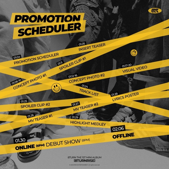 멤버들이 발을 맞대고 있는 사진을 배경으로 폴리스 라인과 스마일 아이콘 요소를 더해 시선을 사로잡는 스케줄러를 공개한 8TURN이 데뷔와 함께 선보일 무한한 가능성에도 뜨거운 관심이 이어지고 있다.