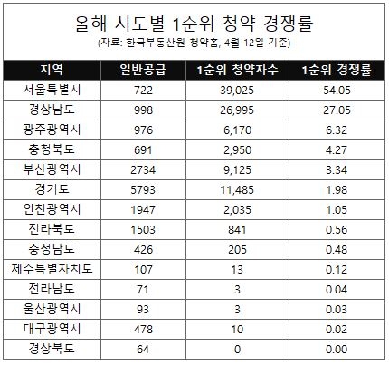 부동산 전문 리서치업체 리얼투데이가 한국부동산원 청약홈 자료를 분석한 결과, 올해(4월 12일 기준) 14개 시도에서 1만6천603가구의 아파트가 일반공급된 가운데 1순위 청약에는 9만8천860명이 신청해 평균 5.95대 1의 경쟁률을 기록했다.