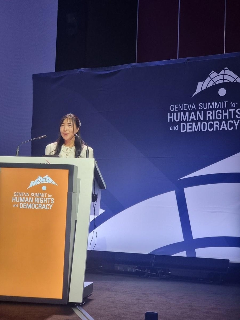한씨는 17일(현지시간) 스위스 제네바 국제콘퍼런스센터에서 국제인권단체들이 매년 개최하는 '인권과 민주주의를 위한 제네바 정상회의' 행사에 참석해 북한을 떠나기까지 겪었던 고초와 잊힐 수 없는 인권 현실을 증언했다.