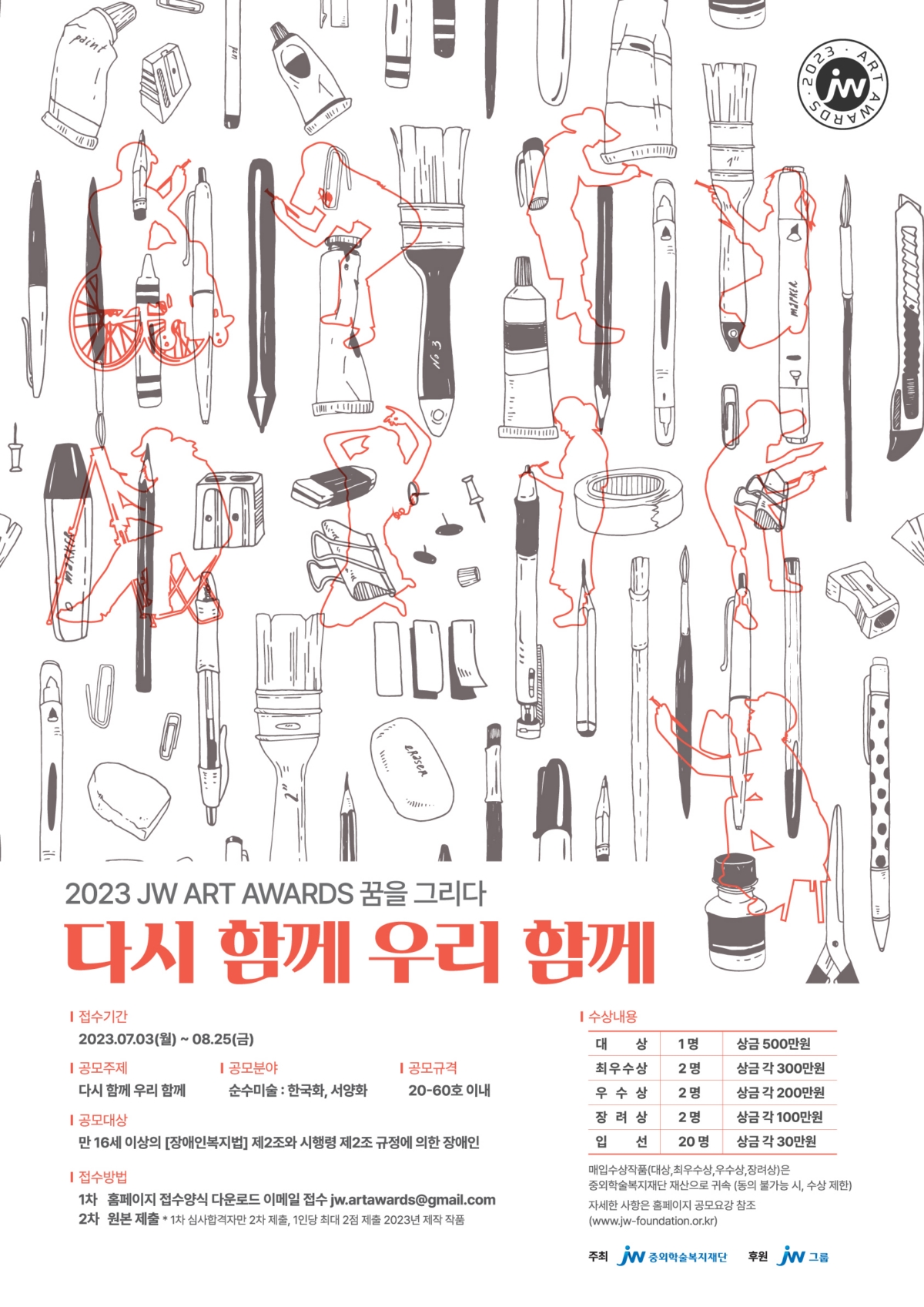 올해로 9회째를 맞는 'JW 아트 어워즈'는 장애 예술인에게 창작활동의 장을 제공하기 위해 마련된 행사로, 기업 공익복지재단이 주최하는 국내 최초의 미술 공모전이다. 총상금은 국내 장애인 미술전 중 최고 수준이다.