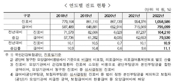 지난해 노인을 포함한 전체 건강보험 진료비는 105조8천586억원으로, 전년 대비 10.9% 증가했다.